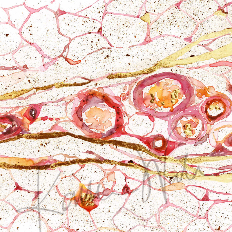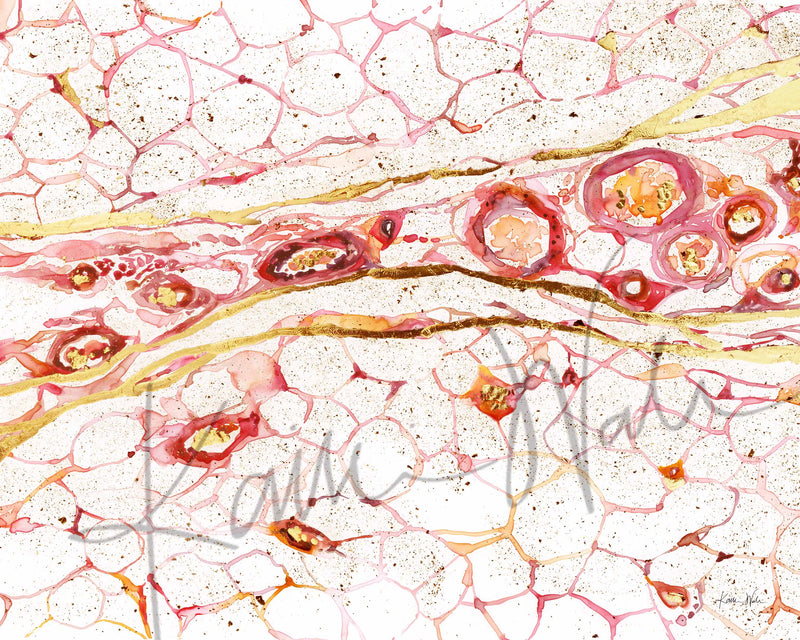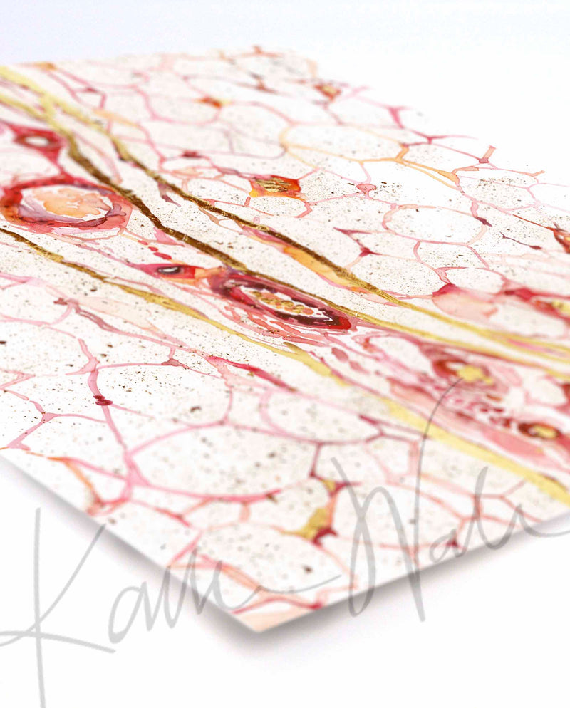 This is a print that I made of the Hypodermis, the deepest layer of skin. This piece is special because it is gilded with gold foil, adding an extra bit of shine to the watercolor. Because this is a print of the original piece, the gold will be visible, but it will not be metallic or have the luster of gold paint.
