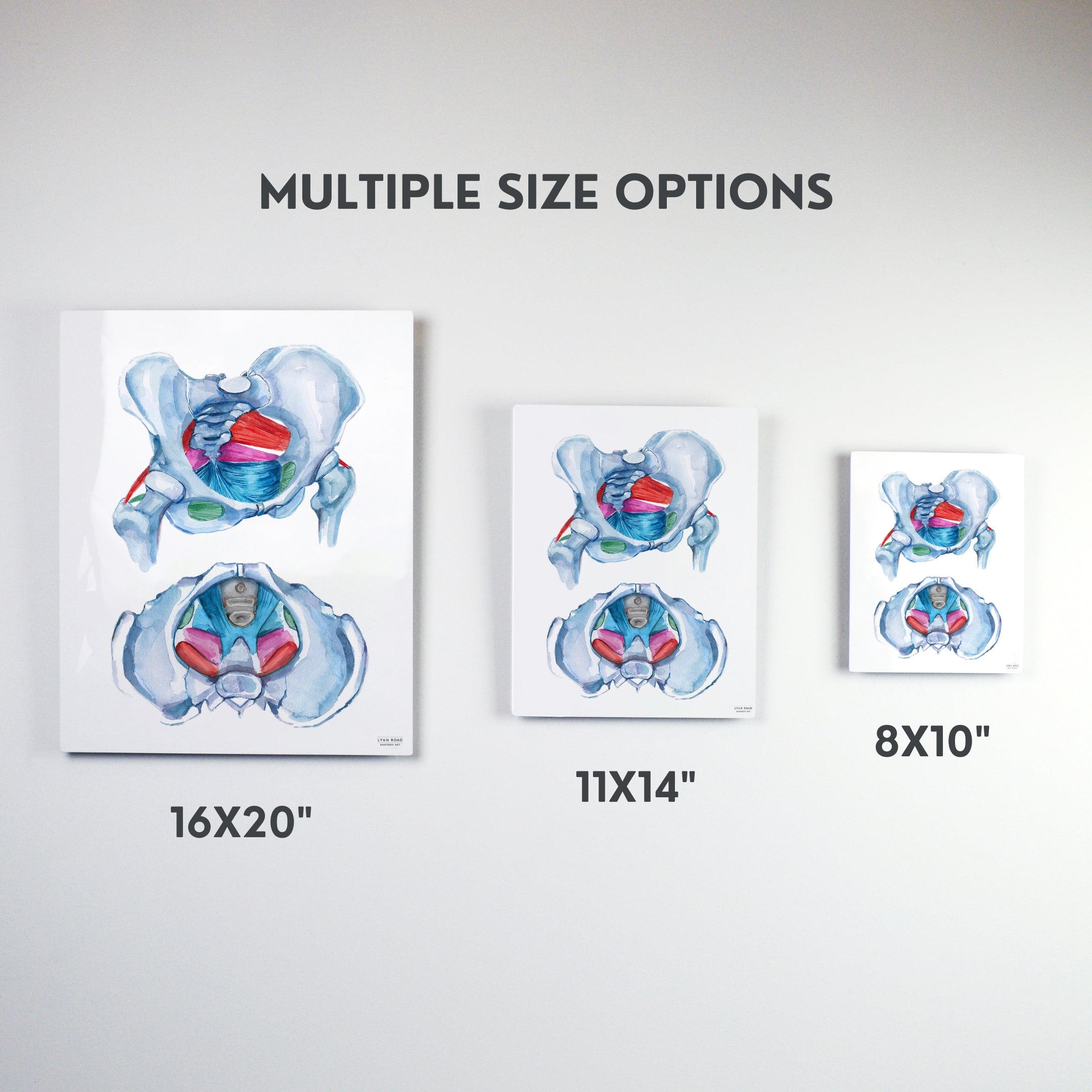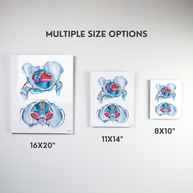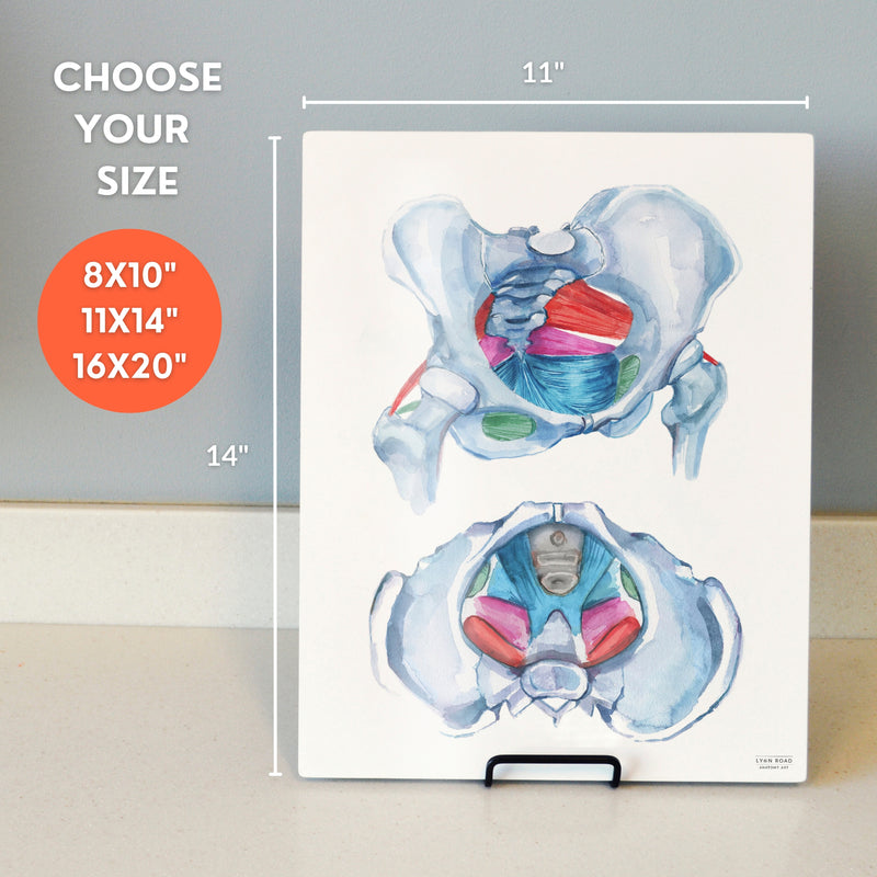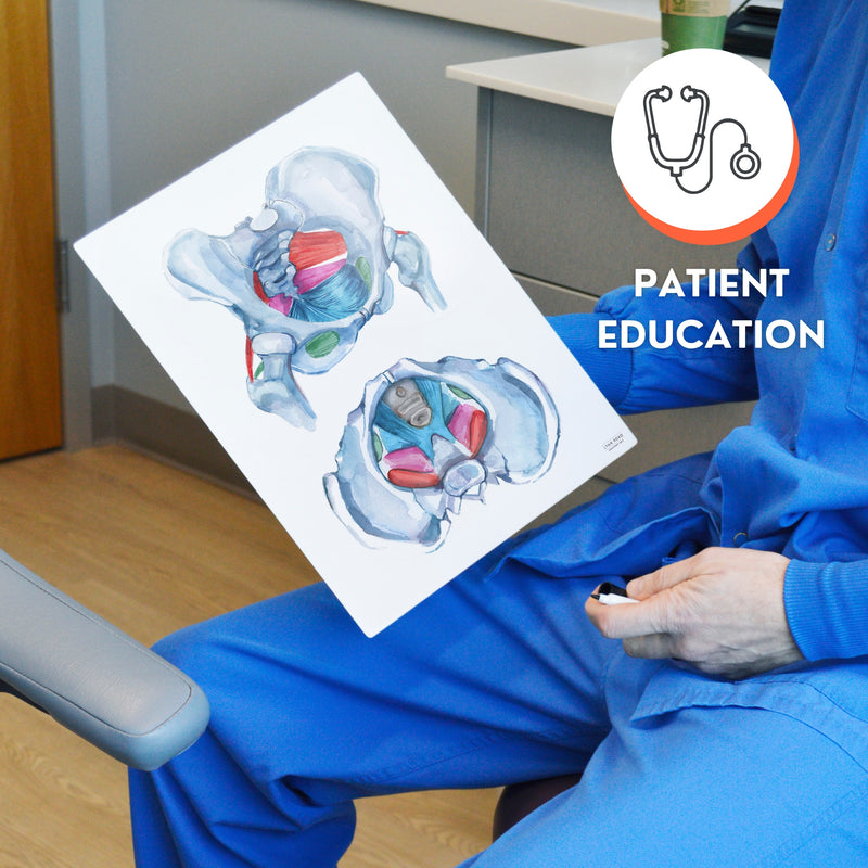The Pelvic Floor Anatomy Diagram Anato-Panel™ is a clear, visually engaging guide to understanding the structure and function of the pelvic floor. This diagram shows the pelvic floor muscles in a top-down view and angled frontal view, helping patients and practitioners better visualize how these muscles support the bladder, uterus, and bowel.