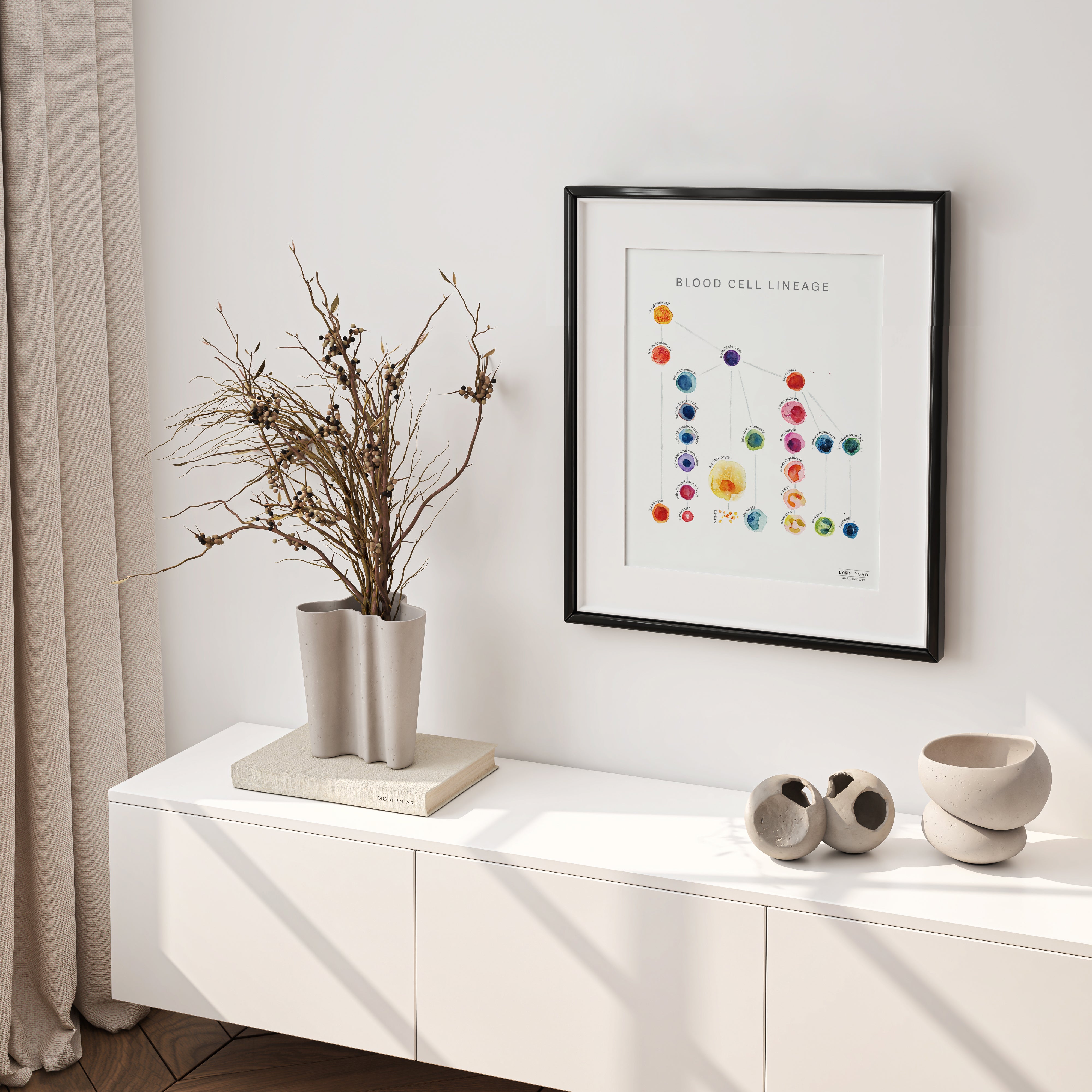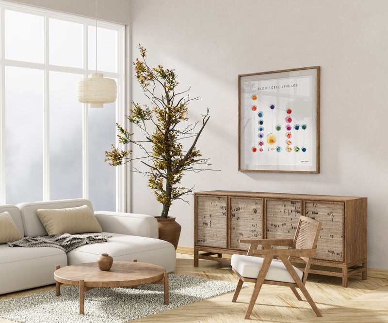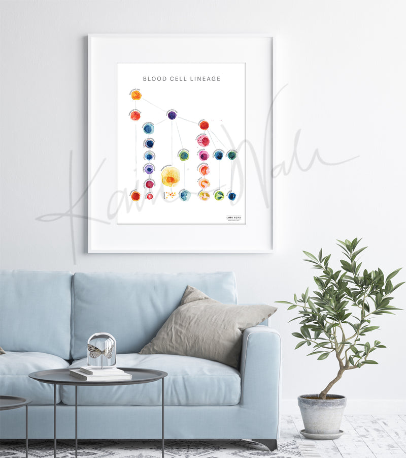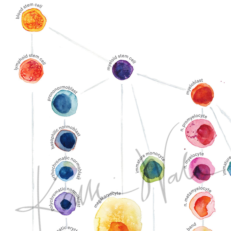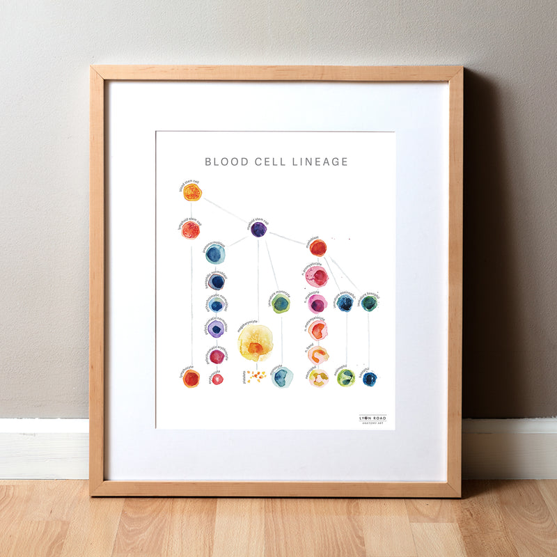 This listing is for an anatomy art print of an original watercolor poster that I created. It shows the lineage of blood cells in a bright color palette, with informative but unobtrusive labels. The perfect addition to any appreciator of anatomy, and lovely art for a hematologist office, oncology office or immunology clinic.