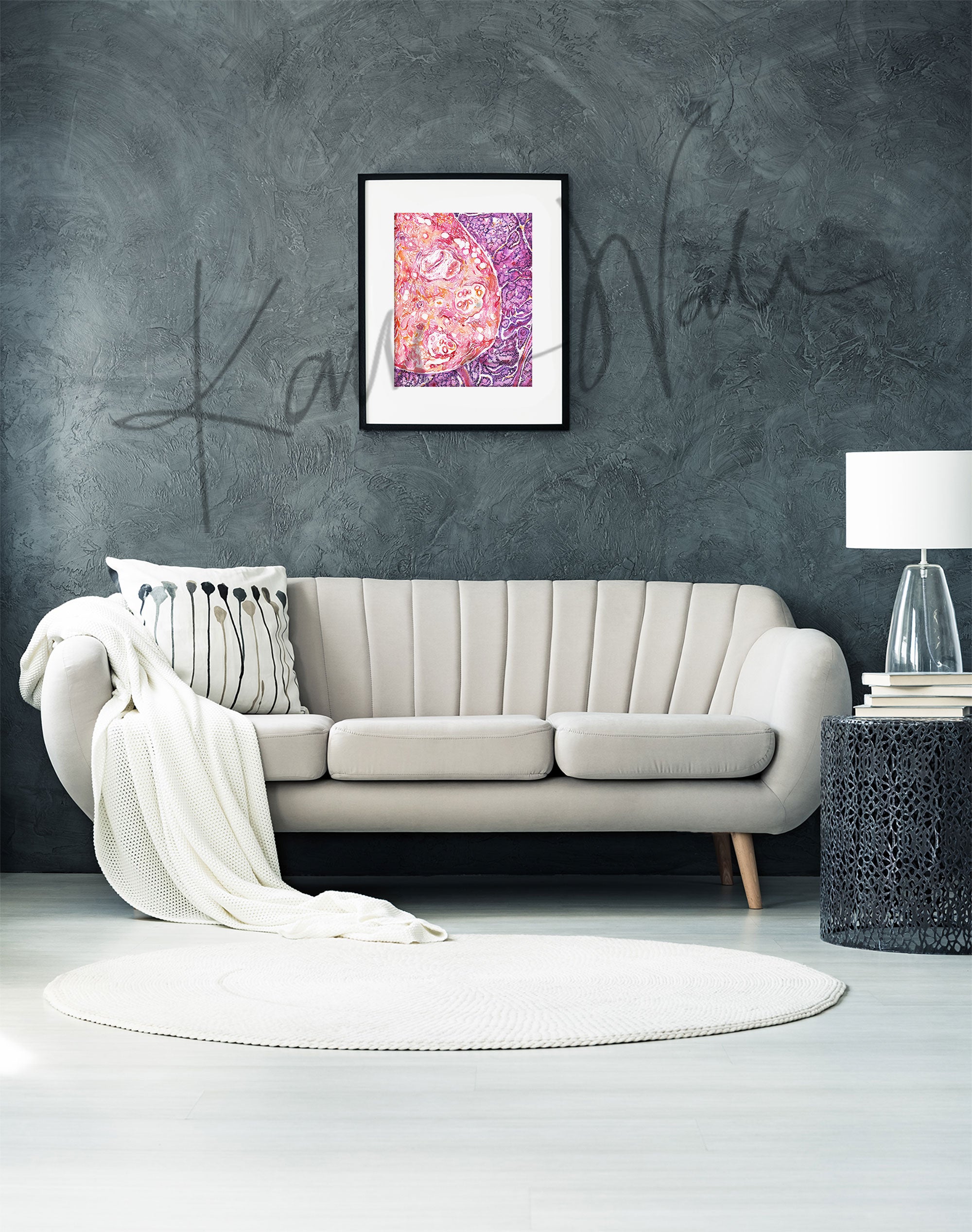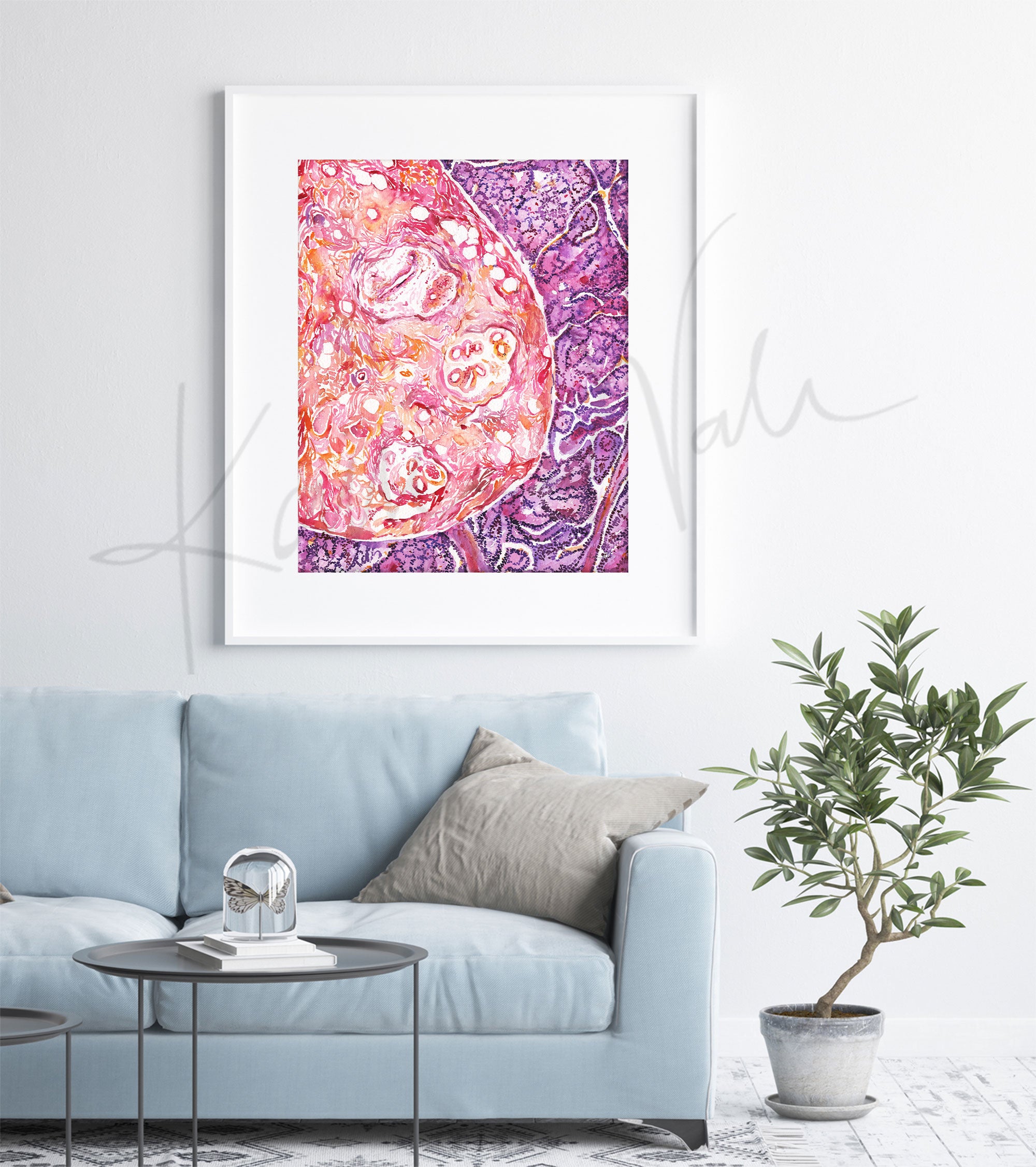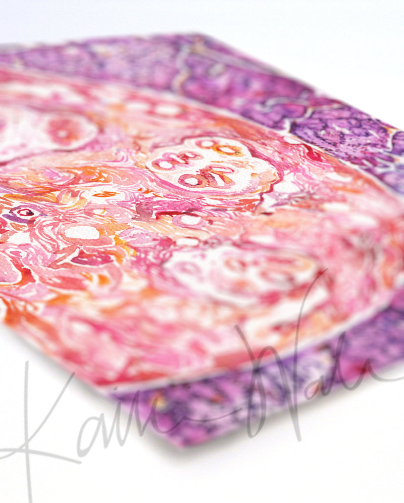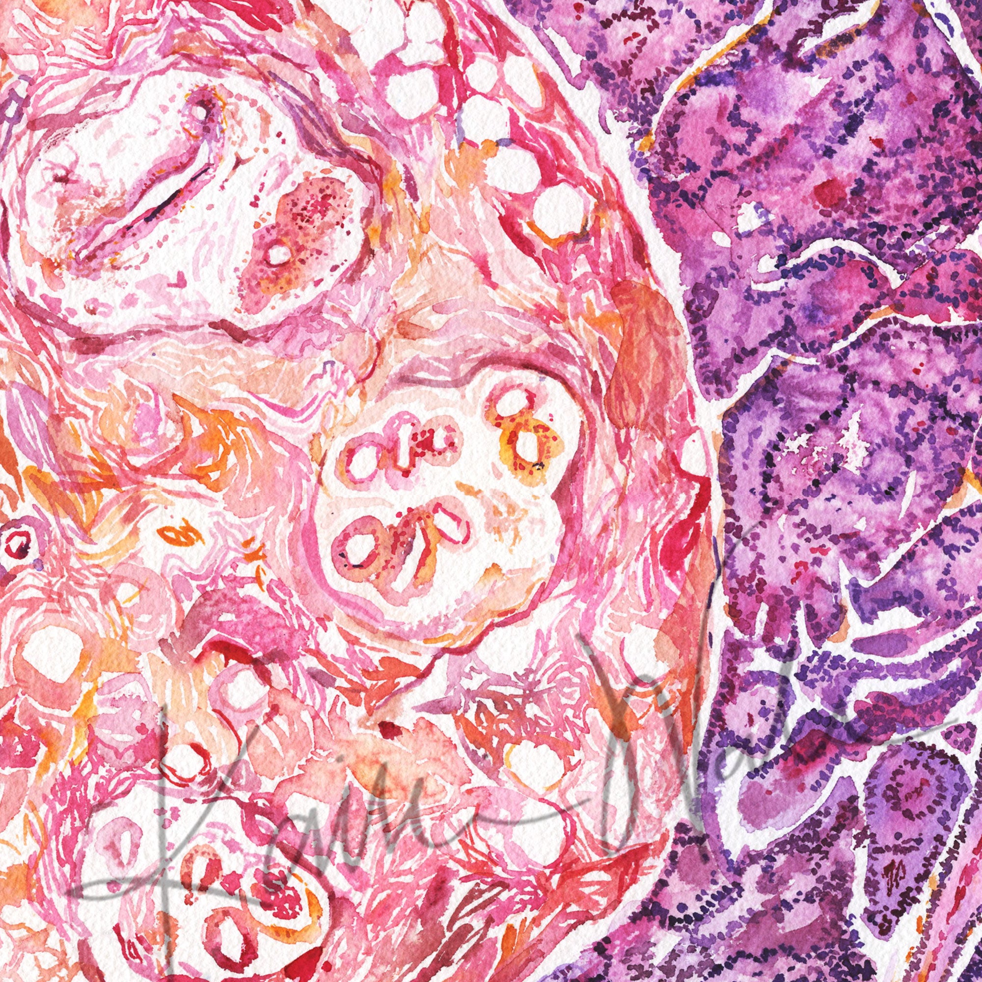 This abstract watercolor print was painted as a gift for a breast pathologist. The painting shows the normal, healthy breast tissue surrounded by dark purple cancer cells. The histological view is both haunting and beautiful.