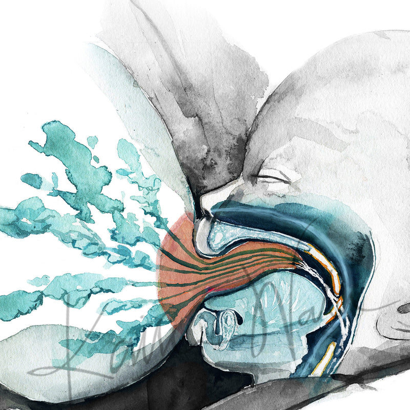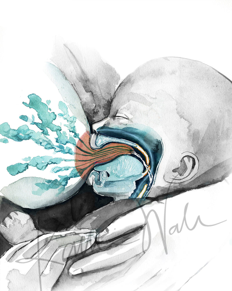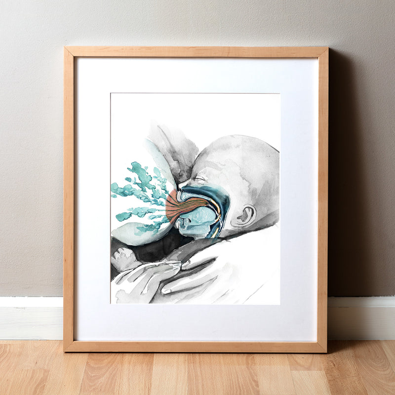 This anatomy art print illustrates the physiology of breastfeeding, featuring the lactating breast and the infant’s unique oropharyngeal anatomy that allows babies to suck, swallow, and breathe at the same time. Rendered with soft color and thoughtful composition, it explains complex anatomy in a calm, approachable way.