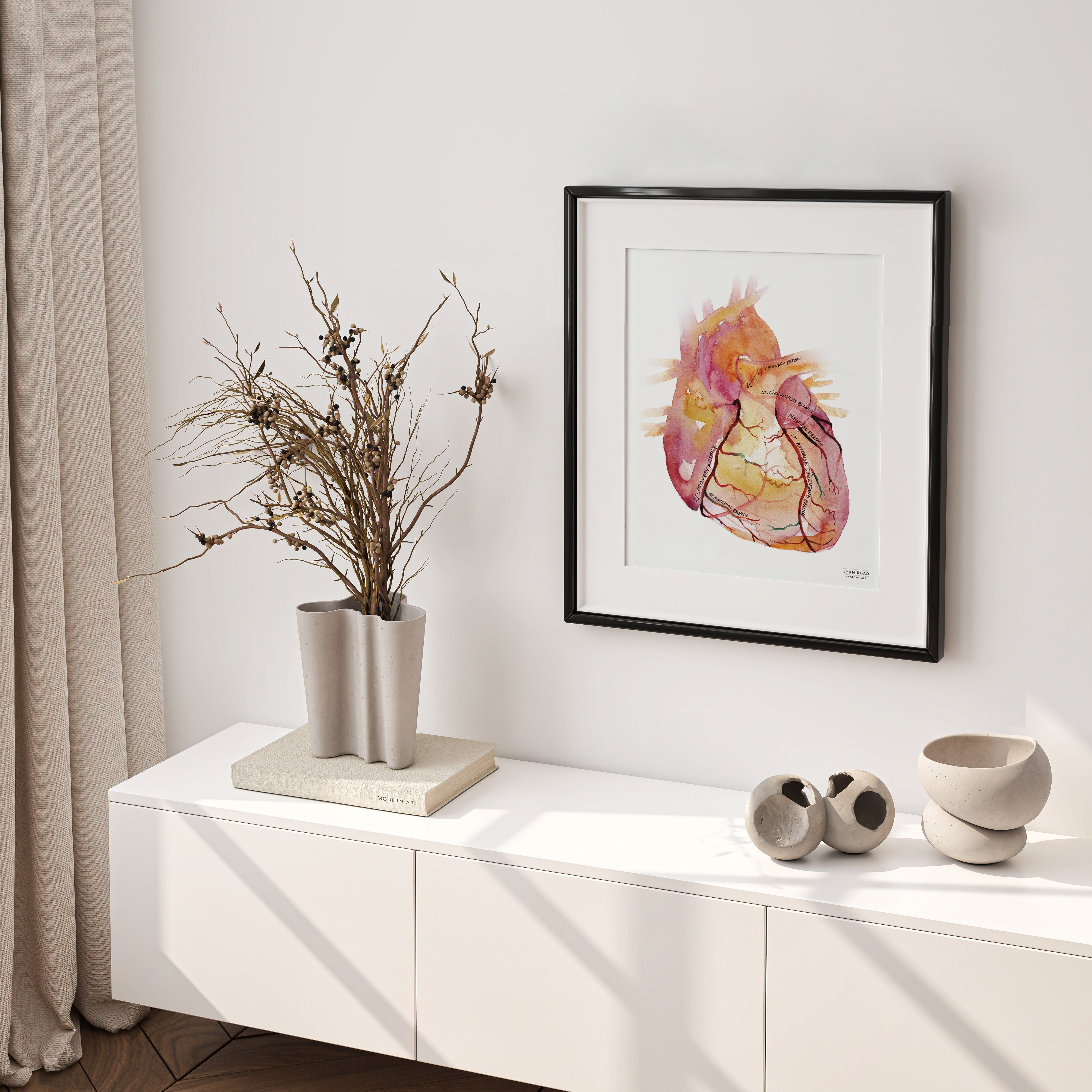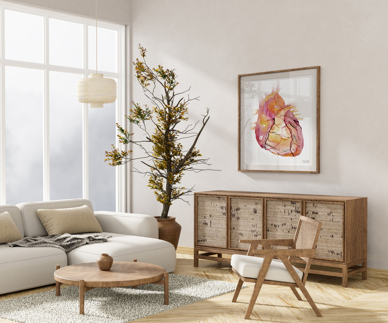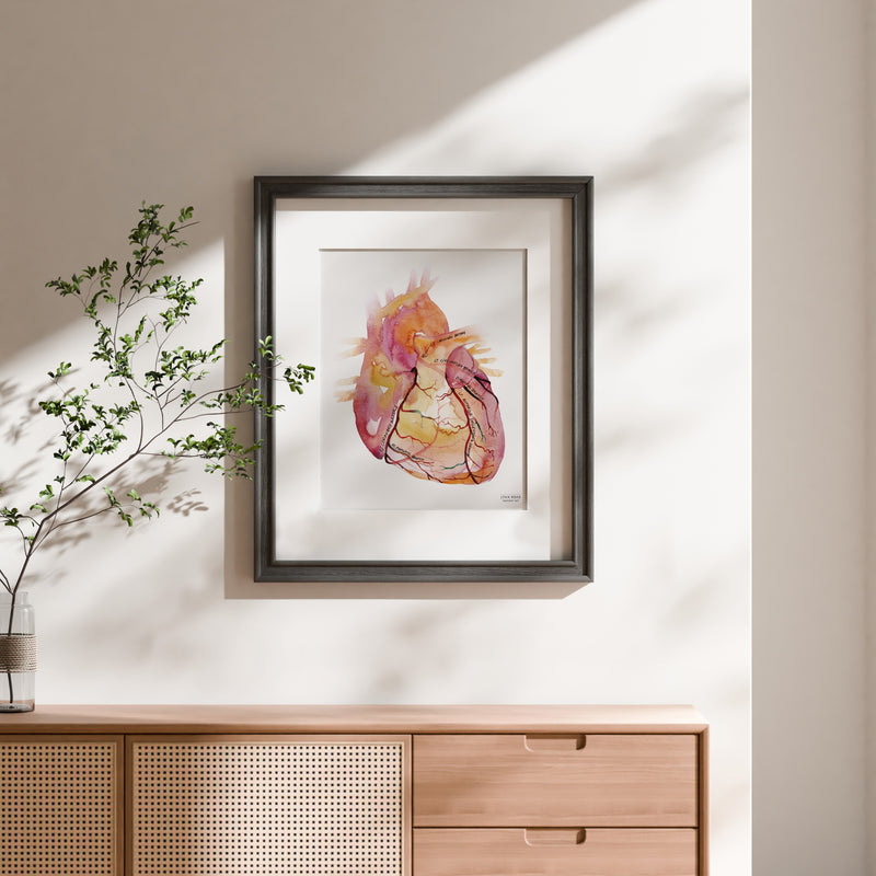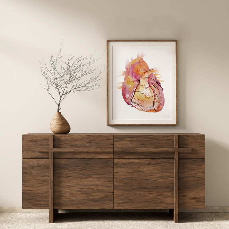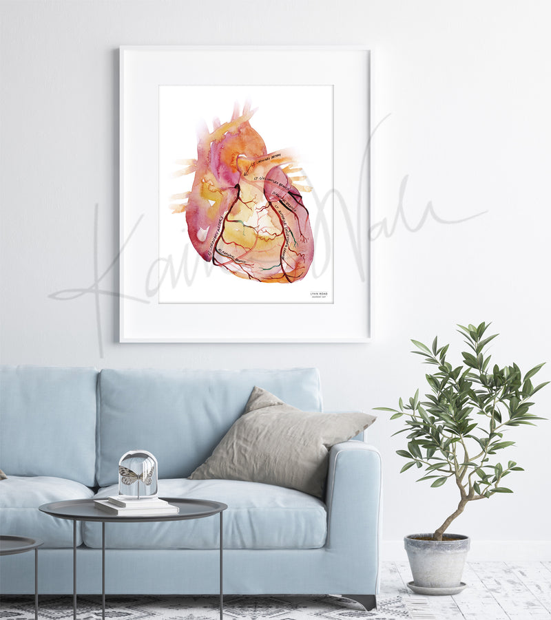 This Coronary Arteries is the perfect heart anatomy medical poster for any emergency medicine doc or cardiologist’s office. Based on an original hand-painted watercolor, it is fine art one second, helpful patient education the next. All coronary arteries are clearly labeled and the transparently painted heart showcases both the anterior and posterior aspects of the vessels.