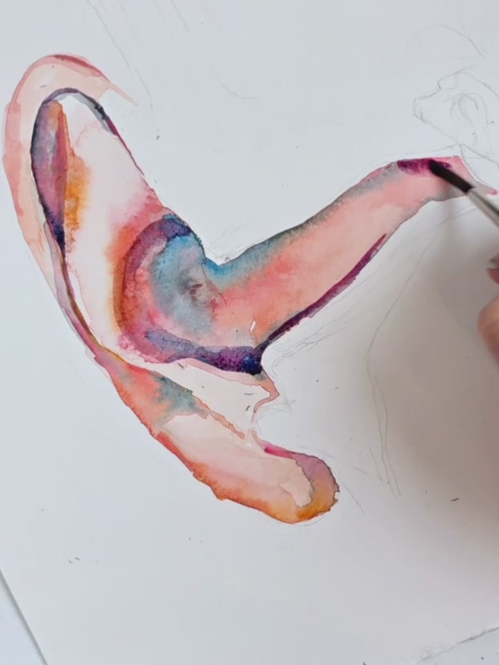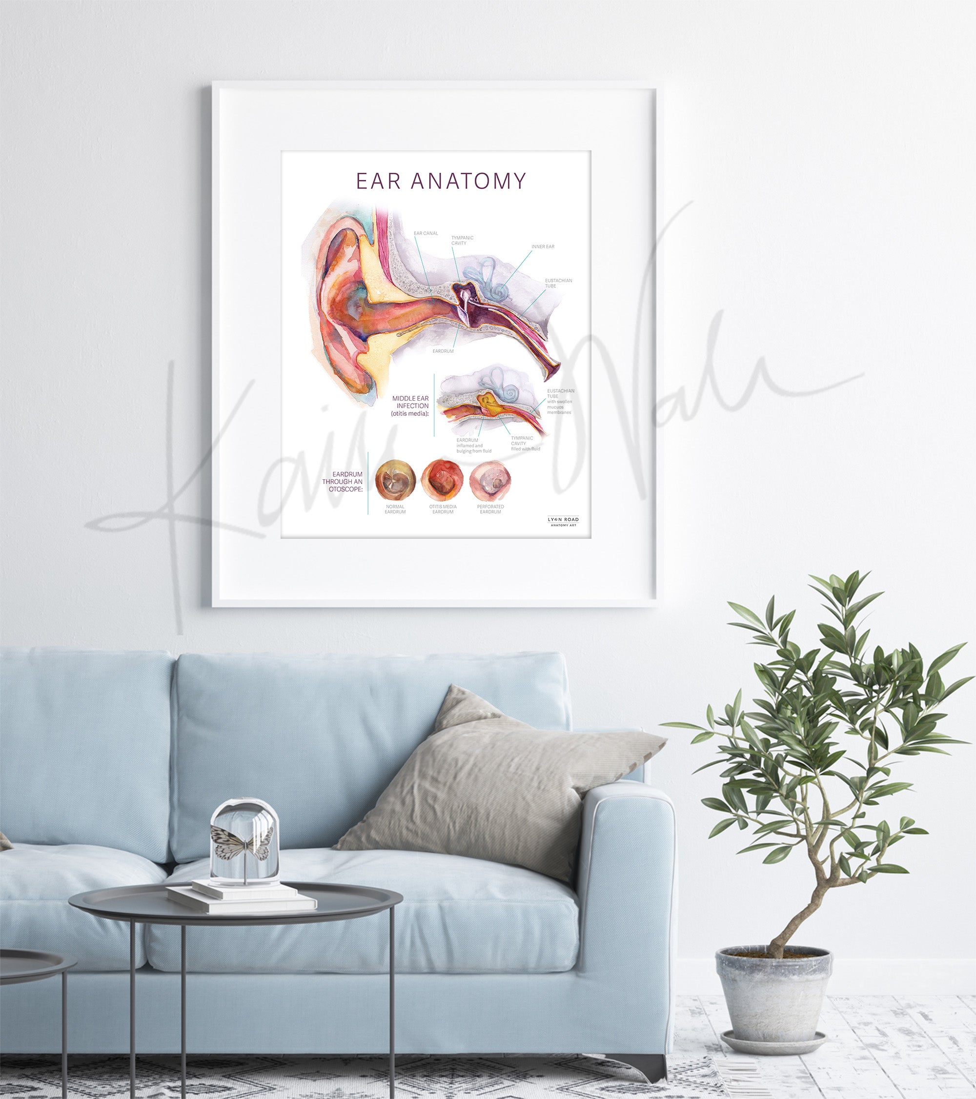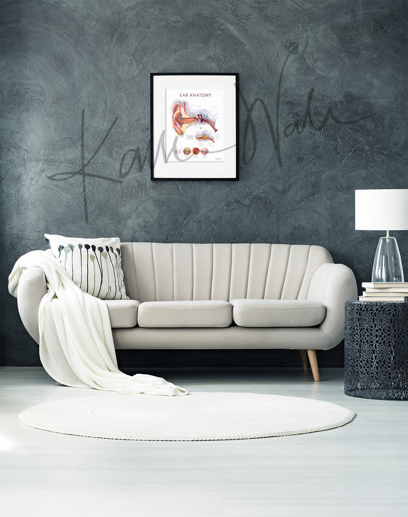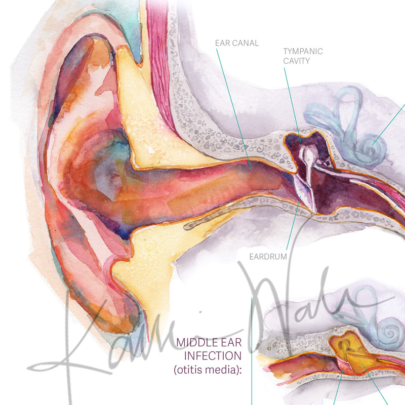 This ear anatomy poster blends education with art. It shows the patient-relevant anatomy of the ear, the anatomy of a middle ear infection, and a visual of what doctors see of the eardrum through an otoscope. Each illustrative detail, from the ossicles to the perforated ear drum, was hand-painted in watercolor by Kaitlin. The gentle, thoughtful design brings calm to young patients and their parents while enhancing your walls with educational beauty. It is ideal for ENT offices and pediatric clinics.