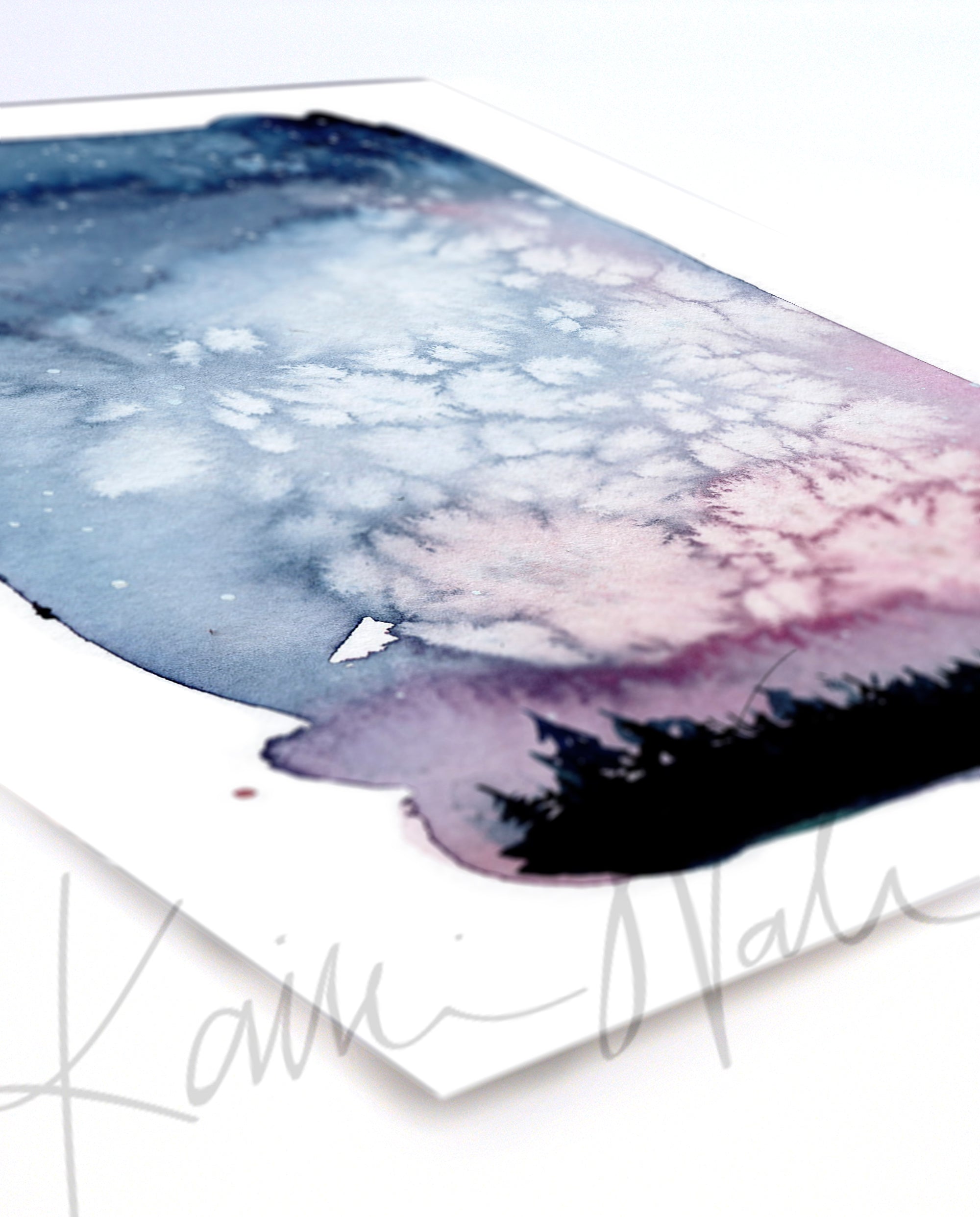 This stunning watercolor print shows a large night sky in a Borialis-type color palette. The small silhouetted trees at the bottom enhance the grandness of the beautiful night sky. I love the watercolor moments that developed in this piece with both wet on half dry and salt techniques!