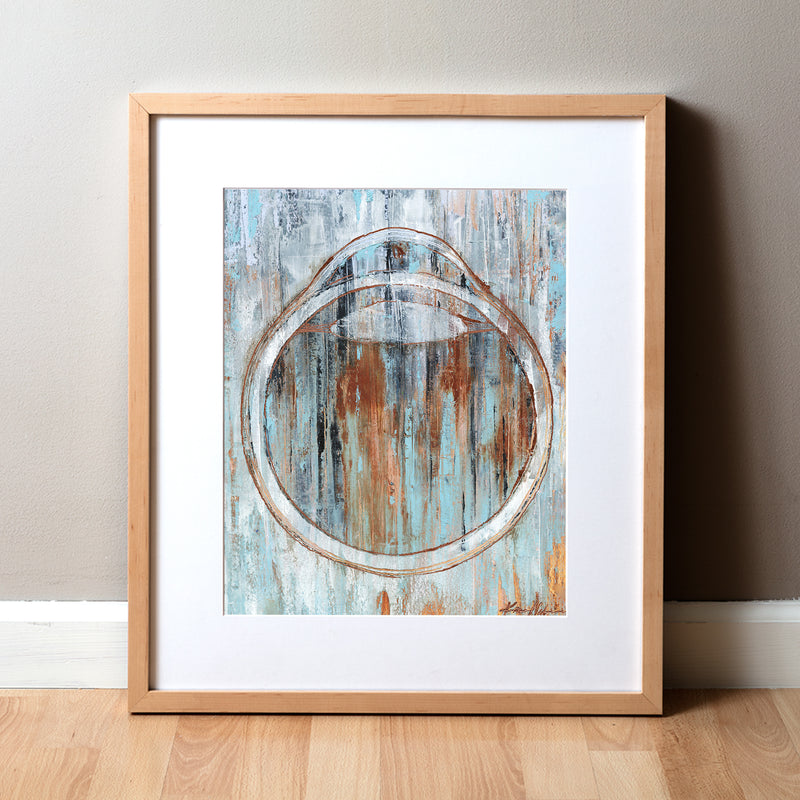 This is a print of an original eye anatomy painting I made out of oil paint and cold wax. The patterning and color palette in gray, white, brown and sky blue strongly reminds me of a birch tree forest. This explains to why I entitled it, “In My Mind’s Eye, for I’m a girl who loves the Wisconsin Northwoods and I find peace and joy when I keep such scenery in my mind’s eye. The anatomy of the painting showcases the cornea, lens, vitreous chamber and retina.