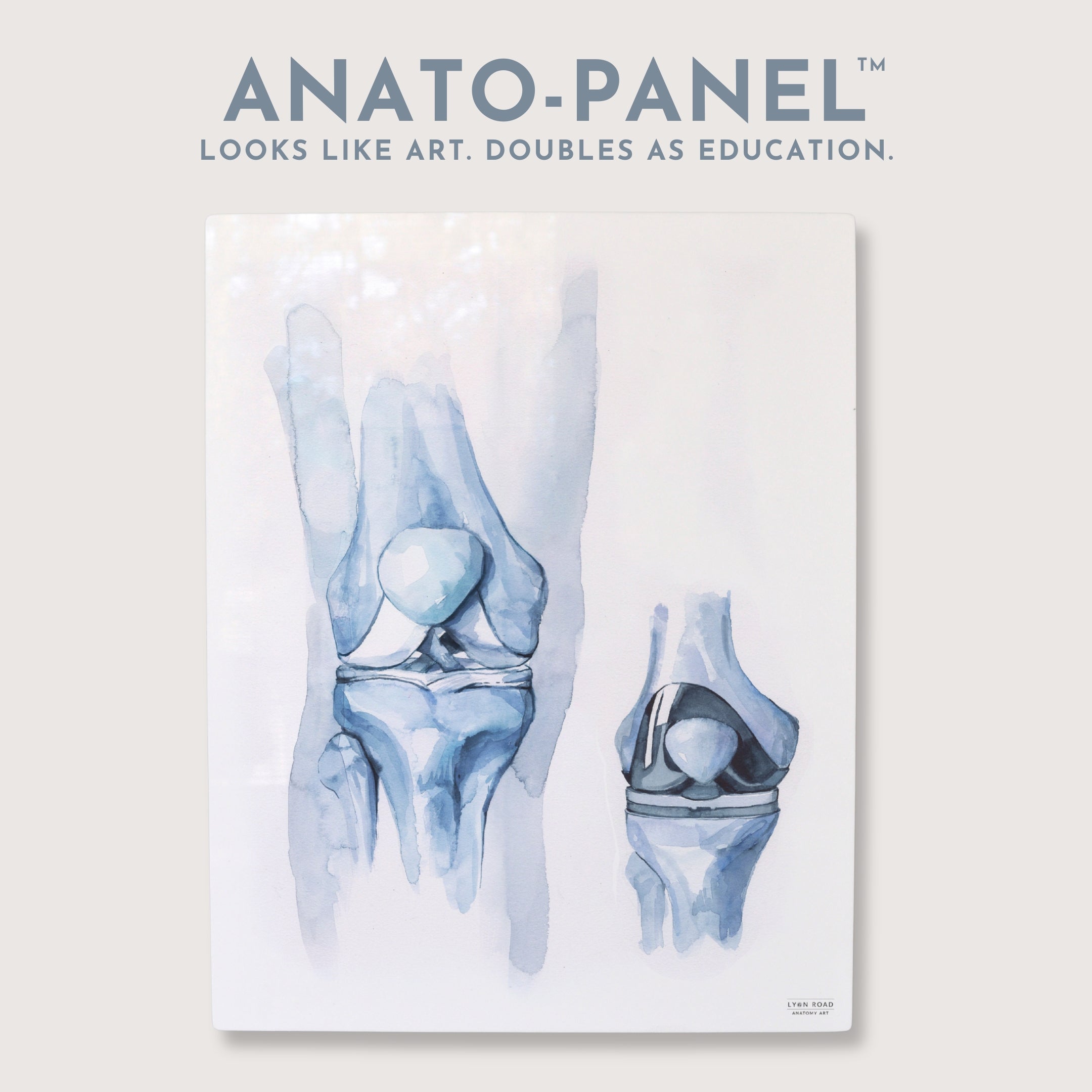This is a bold print of an original watercolor that I made of the knee joint. The anatomy depicted includes the femur, patella, tibia, fibula, lateral collateral ligament and the quad tendon.