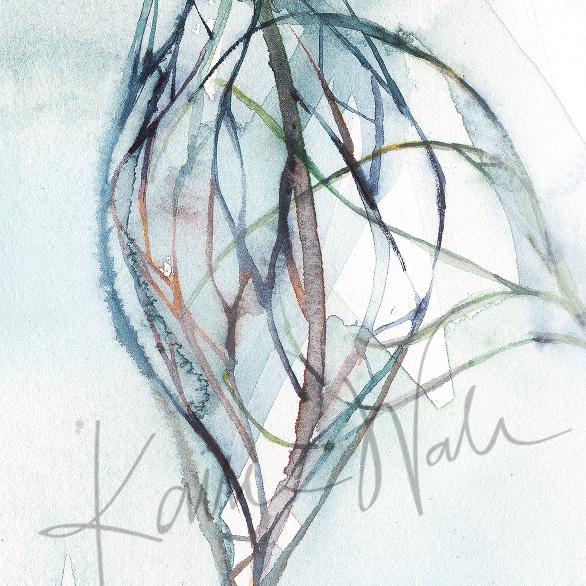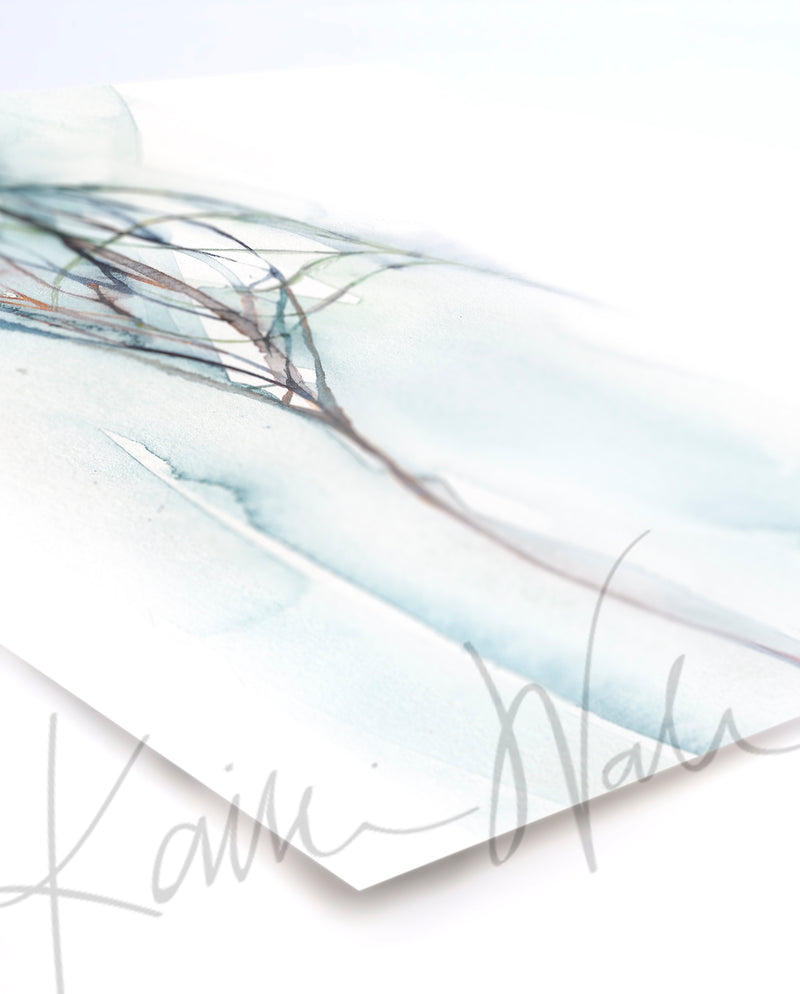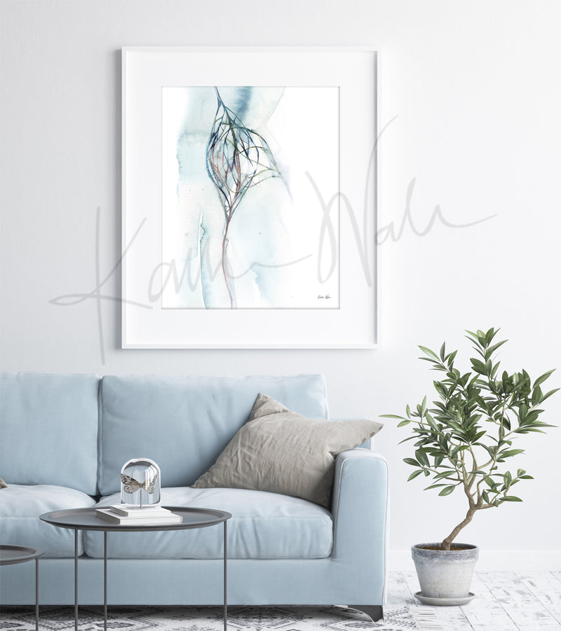 This is a print of a painting by anatomical watercolor artist Kaitlin Walsh. This painting is an abstract representation of lymphatic vessel when it meets a capillary and picks up any excess fluid. The bottom line in the painting showcases an arteriole, the top line a venule and the line coming in from the right is the lymphatic vessel.