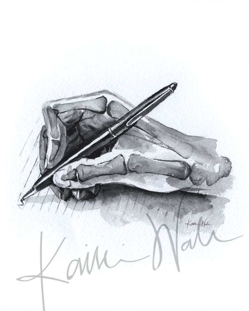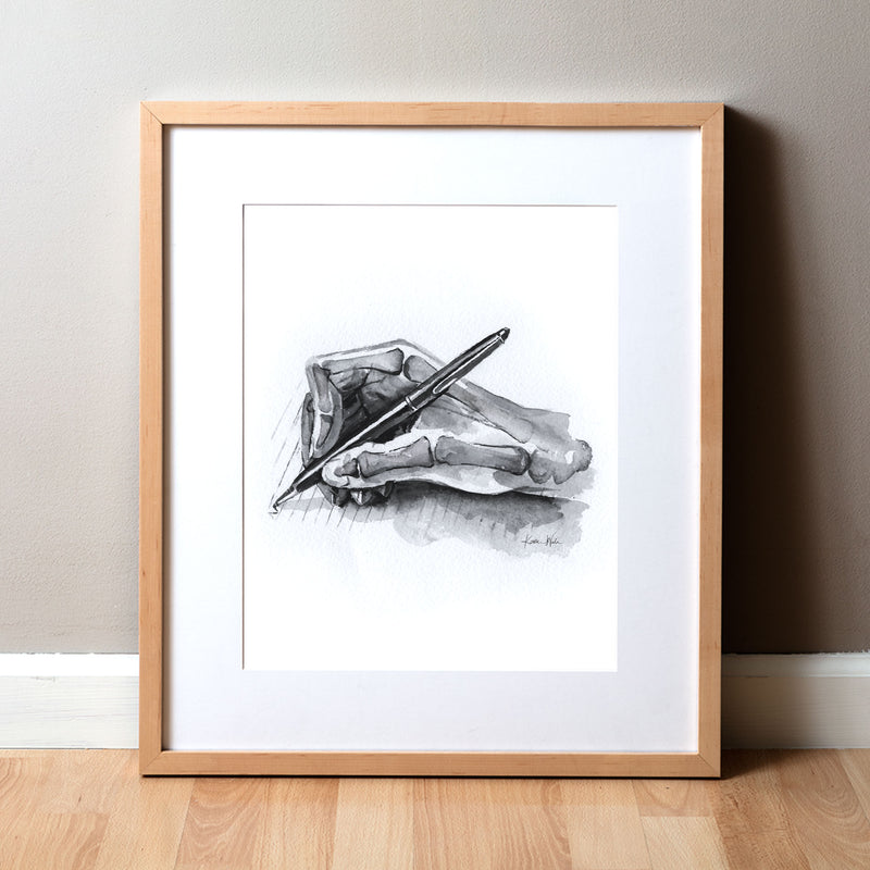 This beautiful black and white watercolor print was created as an illustration for a book. It depicts the hand and it’s skeletal structure in a writing position. This print is perfect in any home or office!