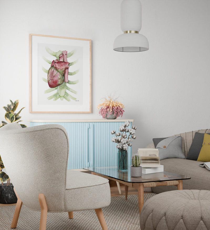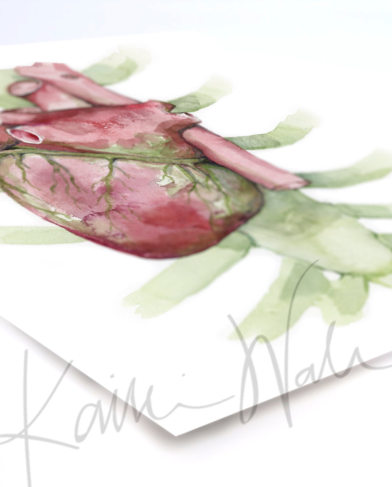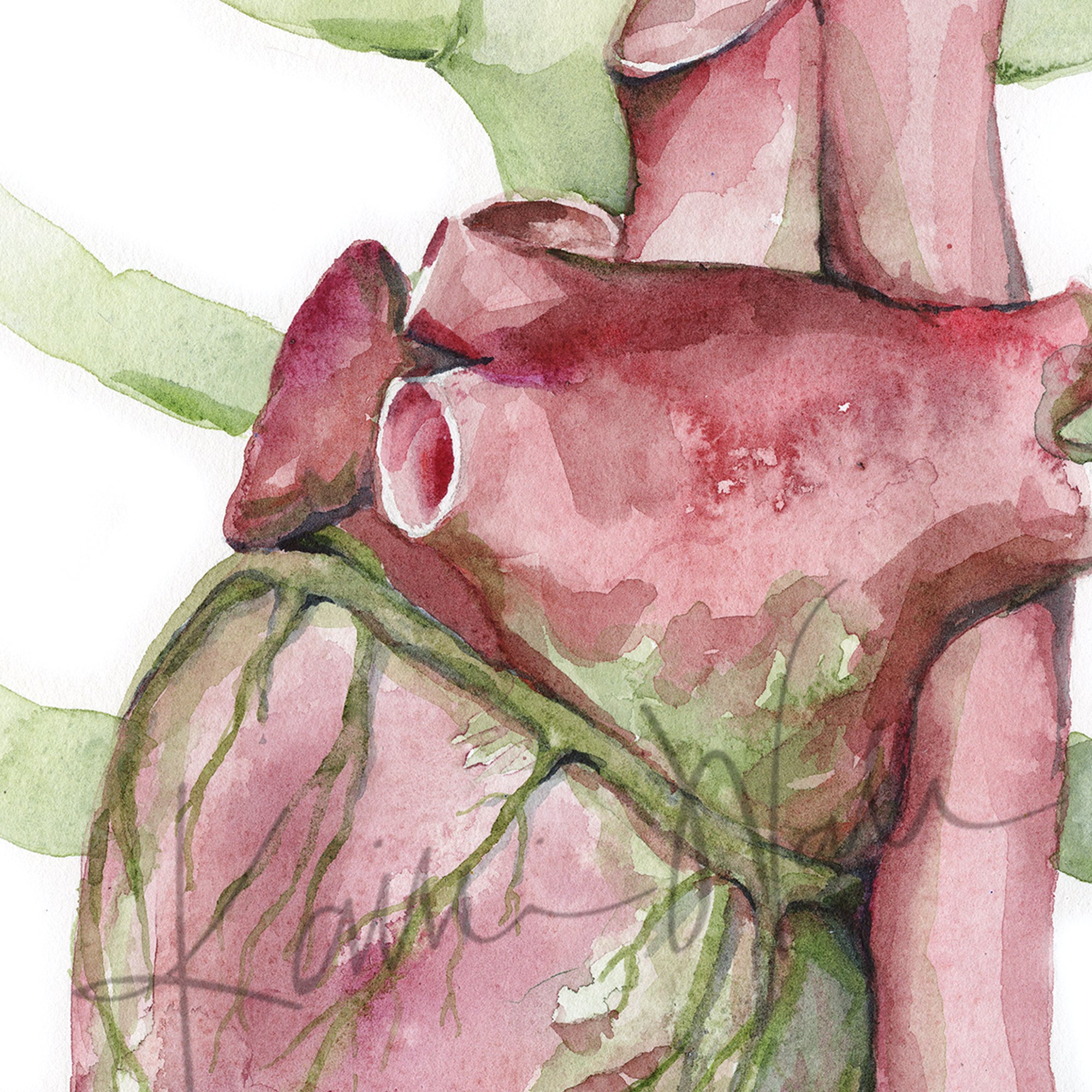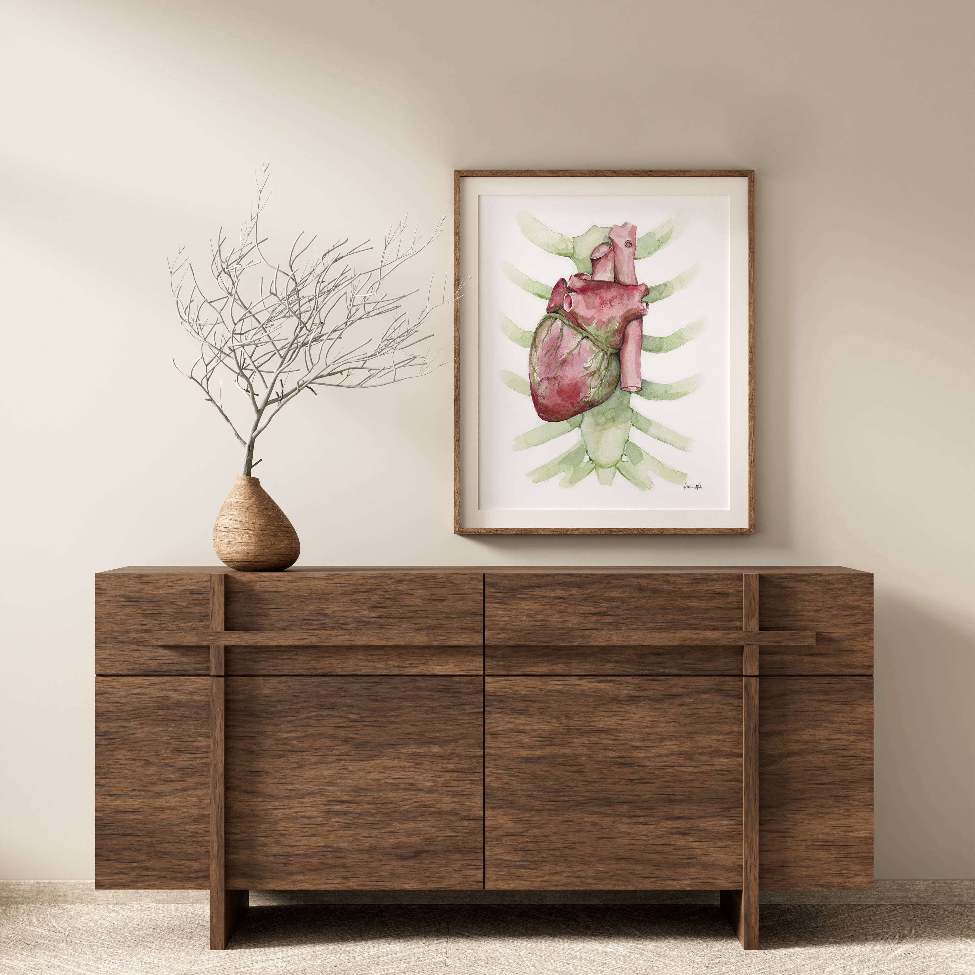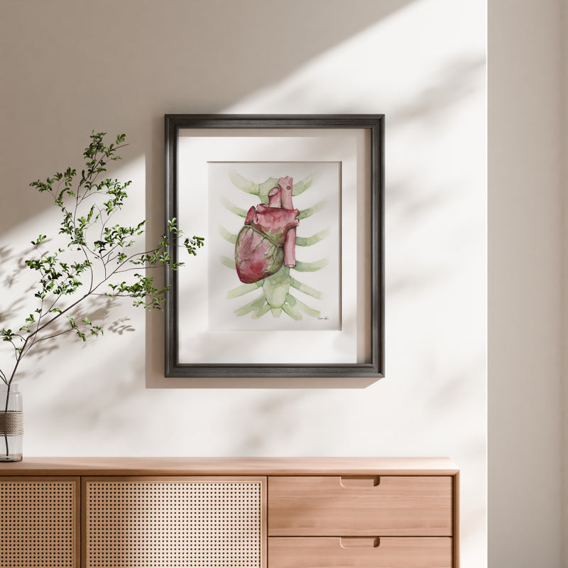 This is a print of a painting of an anatomically correct heart. It showcases a posterior view of the heart, a more rare vantage point. To orient the viewer, I added the ribs and sternum in a soft sage green.
